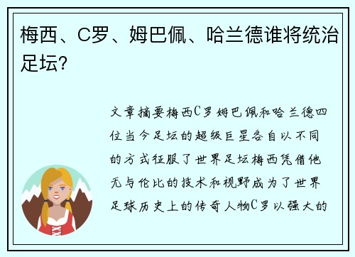 文章摘要:梅西、C罗、姆巴佩和哈兰德,四位当今足坛的超级巨星,各自以不同的方式征服了世界足坛。梅西凭借他无与伦比的技术和视野,成为了世界足球历史上的传奇人物;C罗以强大的身体素质和永不放弃的斗志,书写...