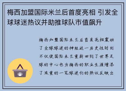 梅西加盟国际米兰后首度亮相,震动了全球球迷的神经。这一历史性时刻不仅使国际米兰重新回到了世界足球的中心,也为梅西的职业生涯增添了浓重的一笔。球迷们的热议反映出梅西的巨大个人影响力,而国际米兰的市值也因...