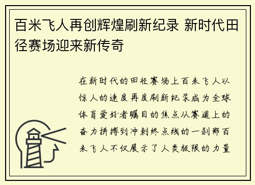 在新时代的田径赛场上,百米飞人以惊人的速度再度刷新纪录,成为全球体育爱好者瞩目的焦点。从赛道上的奋力拼搏到冲刺终点线的一刹那,百米飞人不仅展示了人类极限的力量,也引领着田径世界进入了一个崭新的时代。本...