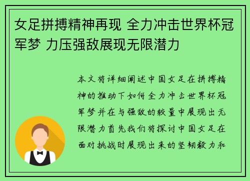 本文将详细阐述中国女足在拼搏精神的推动下,如何全力冲击世界杯冠军梦,并在与强敌的较量中展现出无限潜力。首先,我们将探讨中国女足在面对挑战时,展现出来的坚韧毅力和团结精神;其次,分析她们如何通过技术和战...