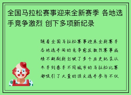 随着全国马拉松赛事迎来全新赛季,各地选手间的竞争愈发激烈,赛事成绩不断刷新,打破了多个历史纪录。从冬季到春季,不同城市的马拉松比赛都吸引了大量的顶尖选手参与,不仅提升了赛事的整体水平,还激发了更多跑者...