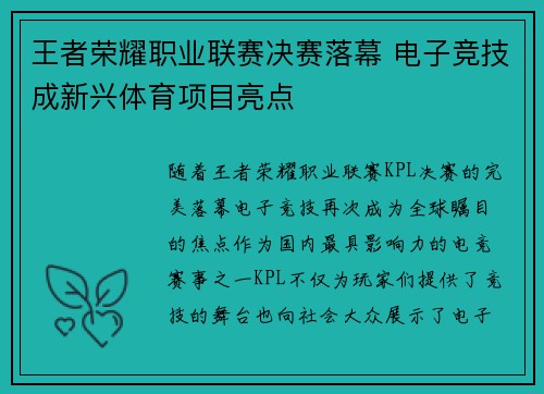 随着王者荣耀职业联赛(KPL)决赛的完美落幕,电子竞技再次成为全球瞩目的焦点。作为国内最具影响力的电竞赛事之一,KPL不仅为玩家们提供了竞技的舞台,也向社会大众展示了电子竞技作为新兴体育项目的巨大潜力...