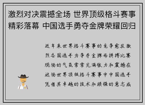 近年来,世界格斗赛事的竞争愈发激烈,各国选手为争夺金牌而拼搏,比赛现场的气氛常常充满张力和震撼。在这场世界顶级格斗赛事中,中国选手凭借其卓越的技术和顽强的意志,成功摘得金牌,成为全场焦点。这不仅代表着...