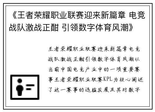 《王者荣耀职业联赛迎来新篇章 电竞战队激战正酣 引领数字体育风潮》以当前中国电竞产业中的一项重要赛事——《王者荣耀职业联赛》(KPL)为核心,阐述了这一赛事的迅猛发展及其对数字体育行业的影响。文章首先...