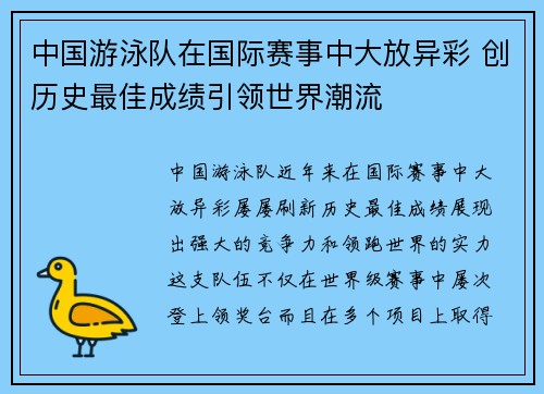 中国游泳队近年来在国际赛事中大放异彩,屡屡刷新历史最佳成绩,展现出强大的竞争力和领跑世界的实力。这支队伍不仅在世界级赛事中屡次登上领奖台,而且在多个项目上取得了突出的成绩,引领着世界游泳的发展潮流。无...