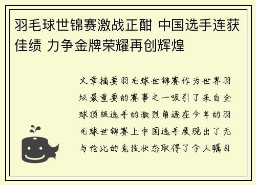 文章摘要:羽毛球世锦赛作为世界羽坛最重要的赛事之一,吸引了来自全球顶级选手的激烈角逐。在今年的羽毛球世锦赛上,中国选手展现出了无与伦比的竞技状态,取得了令人瞩目的成绩。无论是单打项目,还是双打项目,中...