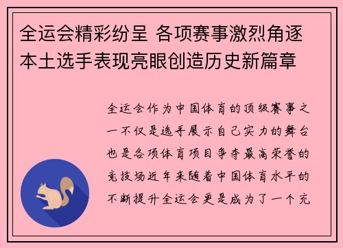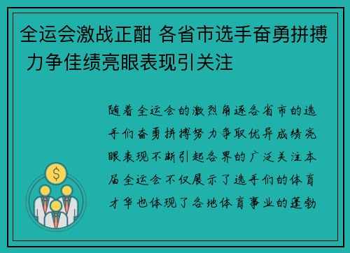 随着全运会的激烈角逐,各省市的选手们奋勇拼搏,努力争取优异成绩,亮眼表现不断引起各界的广泛关注。本届全运会不仅展示了选手们的体育才华,也体现了各地体育事业的蓬勃发展和选手们强烈的竞技精神。在这场盛大的...