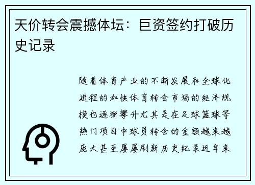 随着体育产业的不断发展和全球化进程的加快,体育转会市场的经济规模也逐渐攀升。尤其是在足球、篮球等热门项目中,球员转会的金额越来越庞大,甚至屡屡刷新历史纪录。近年来,出现了一些天价转会,这些转会不仅仅是...