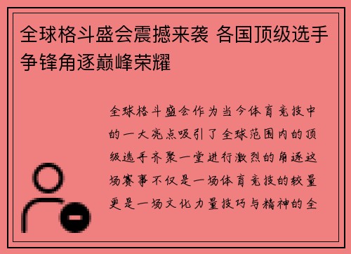 全球格斗盛会作为当今体育竞技中的一大亮点,吸引了全球范围内的顶级选手齐聚一堂,进行激烈的角逐。这场赛事不仅是一场体育竞技的较量,更是一场文化、力量、技巧与精神的全面展示。参赛选手们不仅要展现出过人的身...