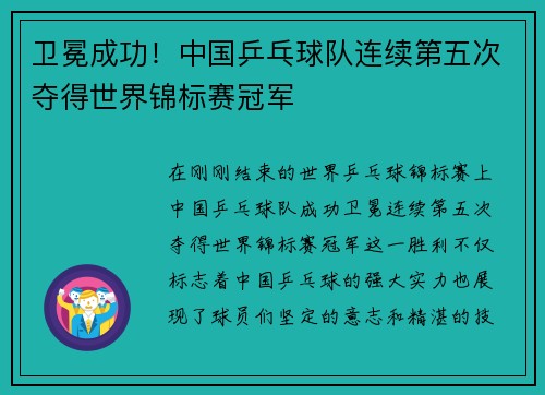 在刚刚结束的世界乒乓球锦标赛上,中国乒乓球队成功卫冕,连续第五次夺得世界锦标赛冠军。这一胜利不仅标志着中国乒乓球的强大实力,也展现了球员们坚定的意志和精湛的技艺。此次卫冕的成功离不开多方面的因素,包括...