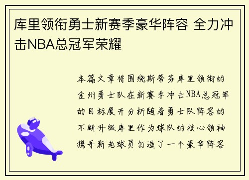 本篇文章将围绕斯蒂芬·库里领衔的金州勇士队在新赛季冲击NBA总冠军的目标展开分析。随着勇士队阵容的不断升级,库里作为球队的核心领袖,携手新老球员打造了一个豪华阵容。本篇将从四个方面详细阐述勇士新赛季的...