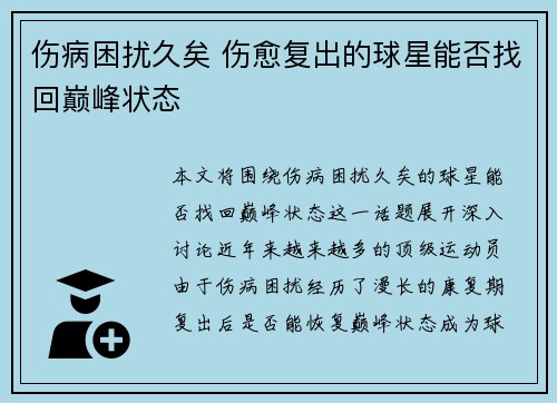 本文将围绕伤病困扰久矣的球星能否找回巅峰状态这一话题展开深入讨论。近年来,越来越多的顶级运动员由于伤病困扰,经历了漫长的康复期,复出后是否能恢复巅峰状态成为球迷与专家关注的焦点。本文将从四个方面分析伤...