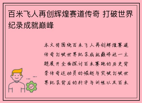本文将围绕“百米飞人再创辉煌赛道传奇 打破世界纪录成就巅峰”这一主题展开,全面探讨百米赛跑的历史背景、传奇运动员的崛起与突破、打破世界纪录背后的科学与训练,以及百米赛道上实现的伟大成就如何引领体育界的...