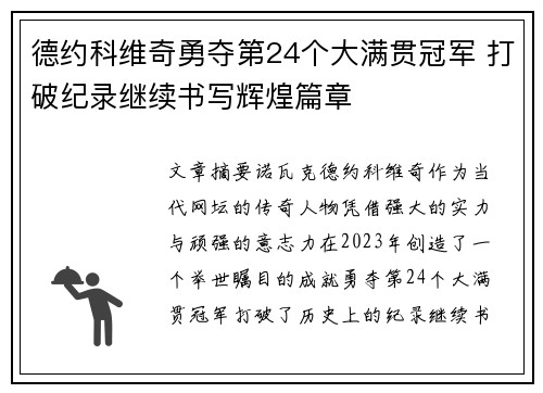 文章摘要:诺瓦克·德约科维奇,作为当代网坛的传奇人物,凭借强大的实力与顽强的意志力,在2023年创造了一个举世瞩目的成就——勇夺第24个大满贯冠军,打破了历史上的纪录,继续书写属于自己的辉煌篇章。德约...