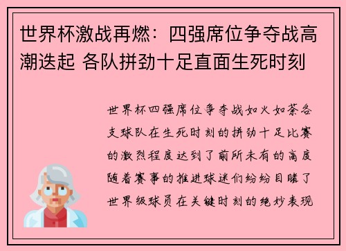 世界杯四强席位争夺战如火如荼,各支球队在生死时刻的拼劲十足,比赛的激烈程度达到了前所未有的高度。随着赛事的推进,球迷们纷纷目睹了世界级球员在关键时刻的绝妙表现,以及战术博弈中的智慧较量。每一场四强席位...