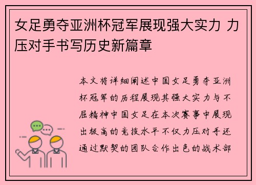 本文将详细阐述中国女足勇夺亚洲杯冠军的历程,展现其强大实力与不屈精神。中国女足在本次赛事中展现出极高的竞技水平,不仅力压对手,还通过默契的团队合作、出色的战术部署和顽强的拼搏精神,书写了历史的新篇章。...