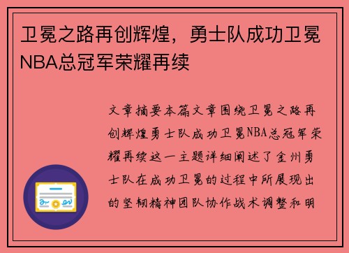 文章摘要:本篇文章围绕“卫冕之路再创辉煌,勇士队成功卫冕NBA总冠军荣耀再续”这一主题,详细阐述了金州勇士队在成功卫冕的过程中所展现出的坚韧精神、团队协作、战术调整和明星球员的表现。文章从四个方面展开...