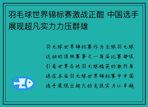 • 羽毛球世界锦标赛激战正酣 中国选手展现超凡实力力压群雄