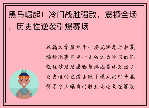 • 黑马崛起!冷门战胜强敌,震撼全场,历史性逆袭引爆赛场