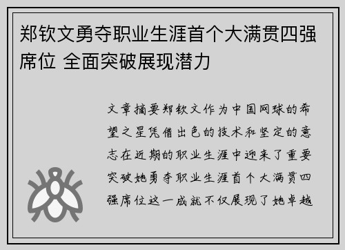 文章摘要:郑钦文作为中国网球的希望之星,凭借出色的技术和坚定的意志,在近期的职业生涯中迎来了重要突破。她勇夺职业生涯首个大满贯四强席位,这一成就不仅展现了她卓越的竞技水平,也标志着她在世界网坛的崛起。...
