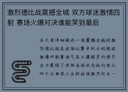 本文将详细阐述一场震撼全城的激烈德比战。在这场比赛中,双方的球迷激情四射,赛场气氛火爆,球员们拼尽全力,展现了顶级竞技状态。我们将从四个方面深入分析这场激烈对决:一是比赛的背景与重要性,二是双方球迷的...