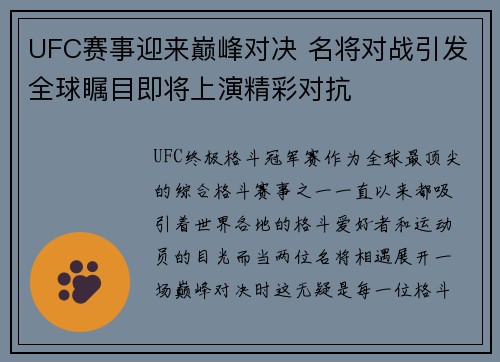 • UFC赛事迎来巅峰对决 名将对战引发全球瞩目即将上演精彩对抗