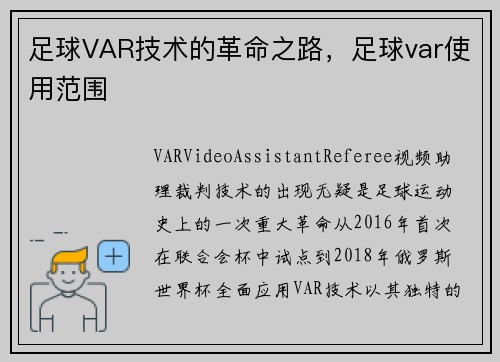 VAR(VideoAssistantReferee,视频助理裁判)技术的出现,无疑是足球运动史上的一次重大革命。从2016年首次在联合会杯中试点,到2018年俄罗斯世界杯全面应用,VAR技术以其独特的...