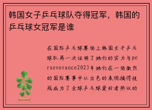 在国际乒乓球赛场上,韩国女子乒乓球队再一次证明了她们的实力与perseverance。2023年,她们在一场激烈的国际赛事中,以出色的表现摘得桂冠,成为了全球乒乓球爱好者热议的焦点。这场胜利不仅是对她...