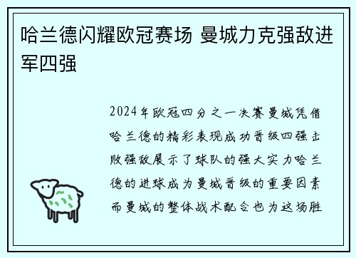 • 哈兰德闪耀欧冠赛场 曼城力克强敌进军四强