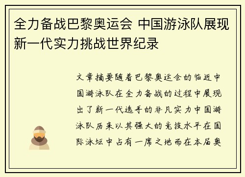 • 全力备战巴黎奥运会 中国游泳队展现新一代实力挑战世界纪录
