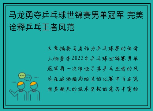 文章摘要:马龙,作为乒乓球界的传奇人物,勇夺2023年乒乓球世锦赛男单冠军,再一次印证了其“乒乓王者”的风范。在这场精彩纷呈的比赛中,马龙凭借其超凡的技术、坚韧的意志、丰富的比赛经验以及无与伦比的竞技...