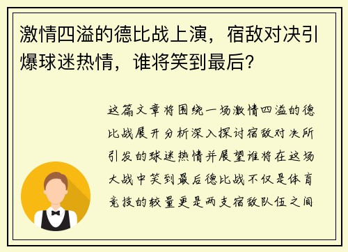 这篇文章将围绕一场激情四溢的德比战展开分析,深入探讨宿敌对决所引发的球迷热情,并展望谁将在这场大战中笑到最后。德比战不仅是体育竞技的较量,更是两支宿敌队伍之间深厚历史和文化背景的象征。通过四个方面的详...