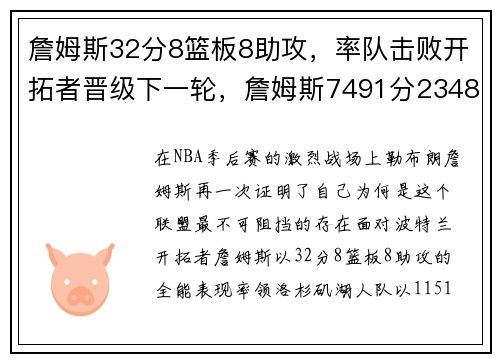 在NBA季后赛的激烈战场上,勒布朗·詹姆斯再一次证明了自己为何是这个联盟最不可阻挡的存在。面对波特兰开拓者,詹姆斯以32分、8篮板、8助攻的全能表现,率领洛杉矶湖人队以115-105击败对手,成功挺进...