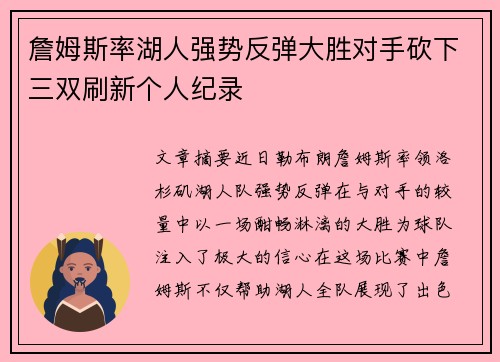 文章摘要:近日,勒布朗·詹姆斯率领洛杉矶湖人队强势反弹,在与对手的较量中,以一场酣畅淋漓的大胜为球队注入了极大的信心。在这场比赛中,詹姆斯不仅帮助湖人全队展现了出色的团队配合与进攻节奏,还通过个人的全...