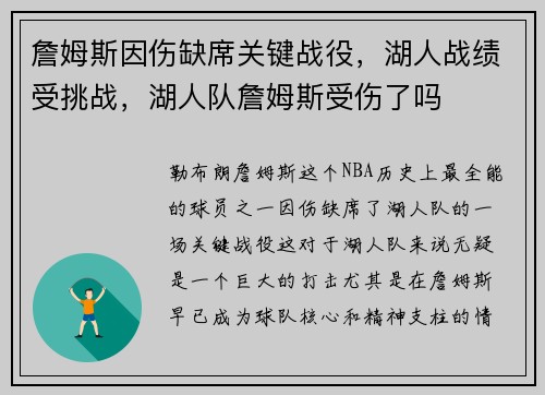 勒布朗·詹姆斯,这个NBA历史上最全能的球员之一,因伤缺席了湖人队的一场关键战役。这对于湖人队来说无疑是一个巨大的打击,尤其是在詹姆斯早已成为球队核心和精神支柱的情况下。他的缺席不仅让球队在攻防两端都...